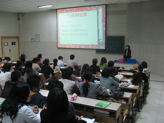 这次宣传会到场240人左右,从后面看过去都是密密麻麻的人头,并且经过互动知道他们多为大四同学!这次宣讲会我先主持了一下,然后请何老师上台讲演,何老师用精辟的言语抓住了同学们的注意力,并且在讲解第二个就业培训大纲——如何面试时,请伊主任上台为大家讲解形象、礼仪知识。伊主任是一位很优雅的女士,尽管这次的宣讲会对于她来说,准备时间太仓促,但是她非常的用心,非常的认真!并且准备了很多不同的彩巾,现场向大家演示传授了关于打造面试形象、按照每人气质不同,进行色彩搭配的要点、面试细节等知识。许多同学,不管是男同学还是女同学,不时认真记录,一位坐在我们身旁的男同学小声对我们说:“这些都是我第一次听到!从来都没有人告诉我们!”